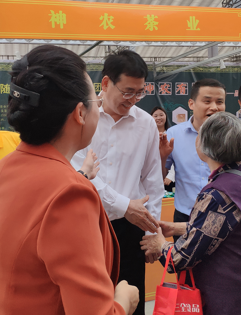 尋根節(jié)期間市委書記陳端峰、市長郭永紅來到神農(nóng)茶業(yè)集團展位與消費者親切交談。